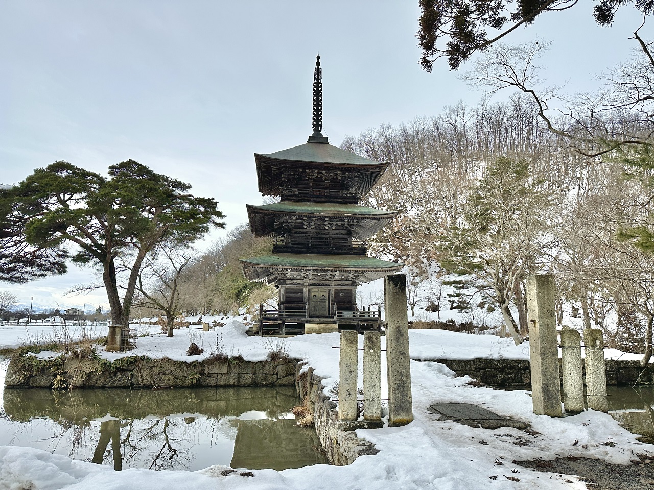 寛政九年(1797)年に再建された三重塔は、高さ17m、銅板茅葺き屋根で、置賜地域唯一の層塔である。